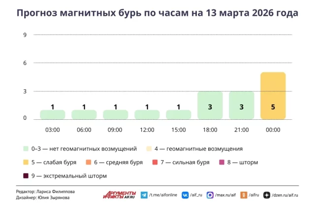 Прогноз магнитных бурь по часам на 13 марта 2026 года. Инфографика | Аргументы и Факты